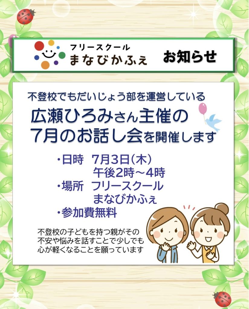 「不登校でもだいじょう部」主催の広瀬ひろみさんとのお話会を開催します