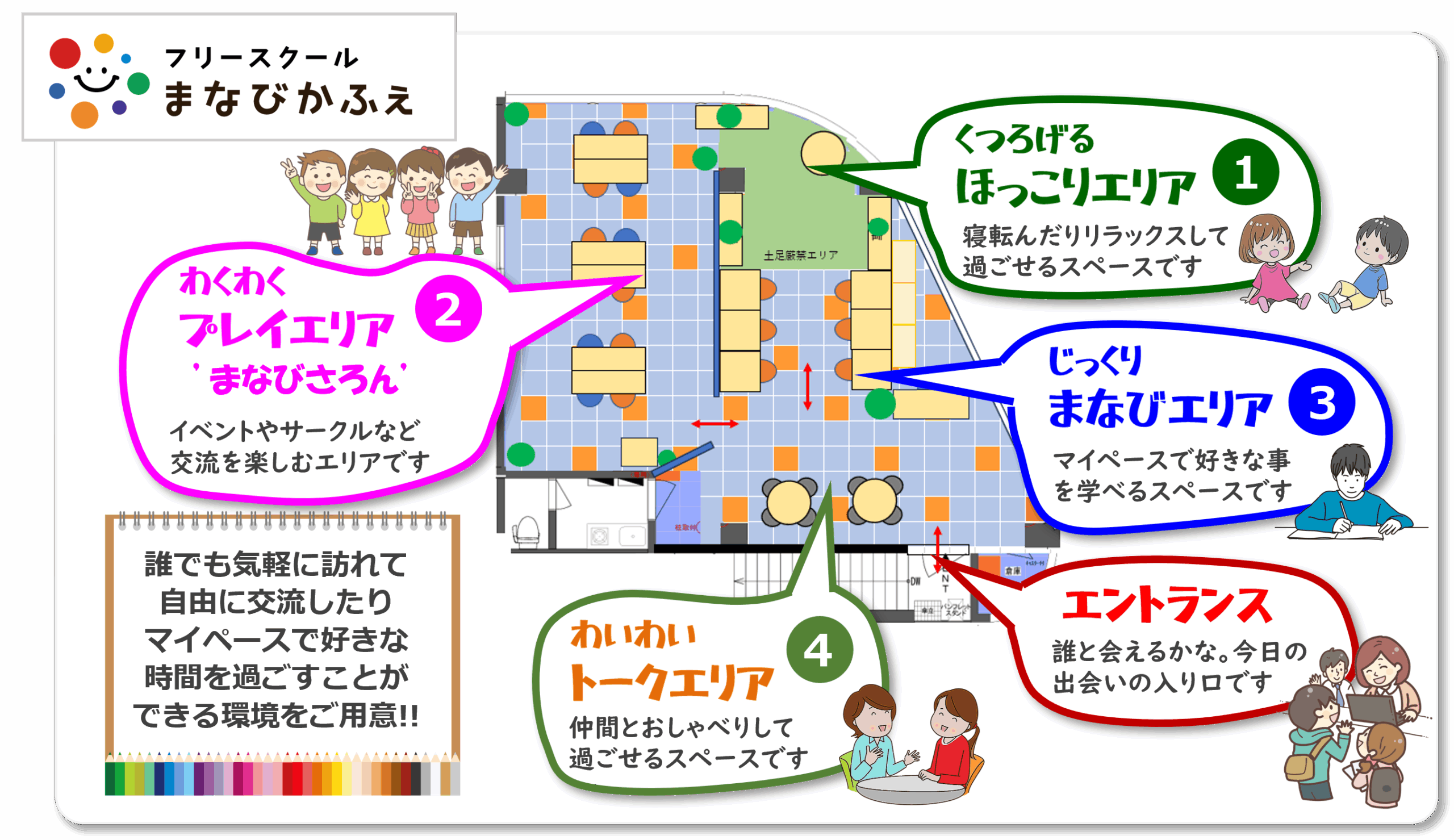 地域との連携をも図れる第三の居場所として、目的別に4つのゾーンを設けました。